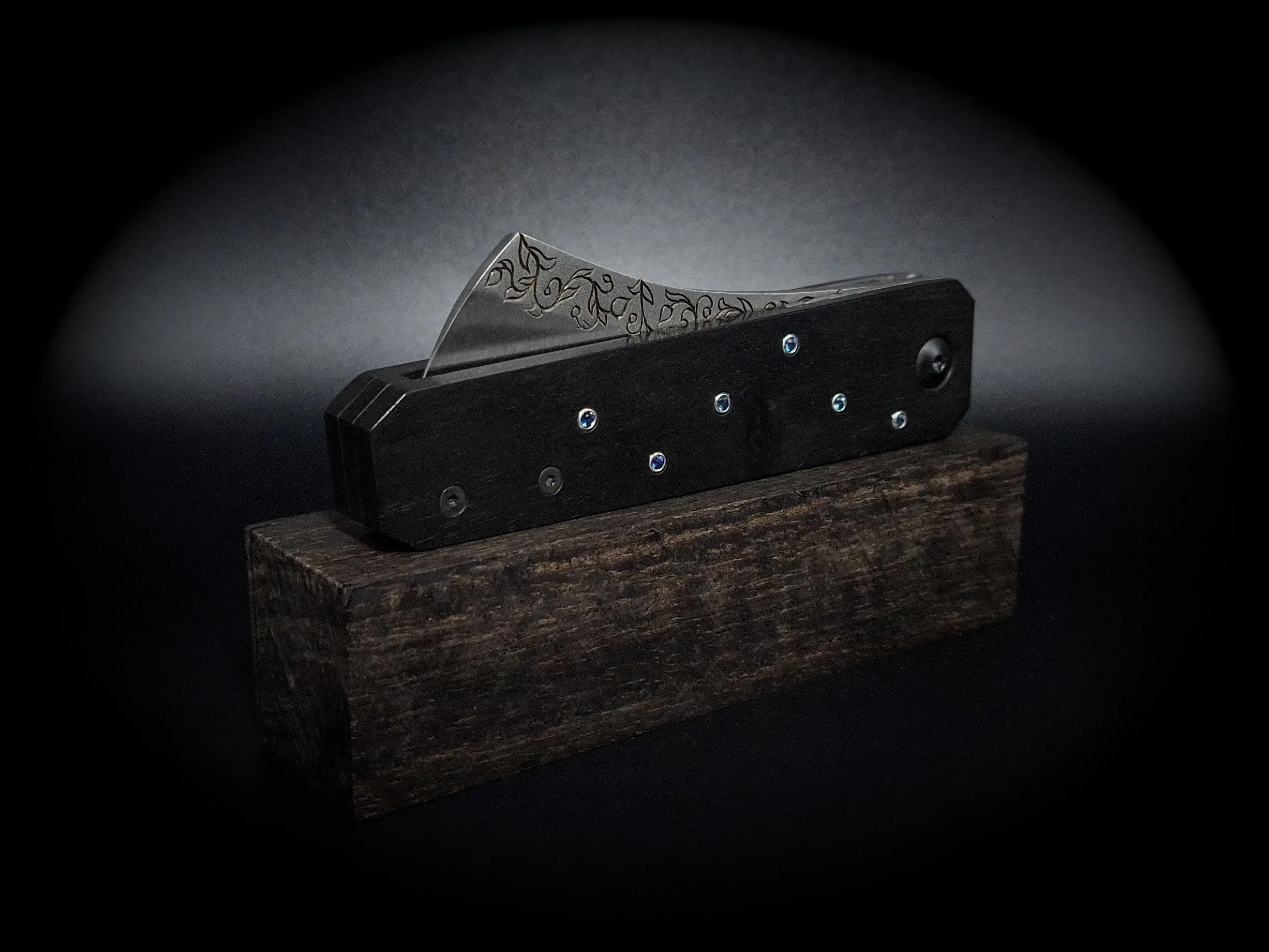 “Mobby Dick”, hand engraved titanium, ebony, apex ultra blade, custom titanium mechanism